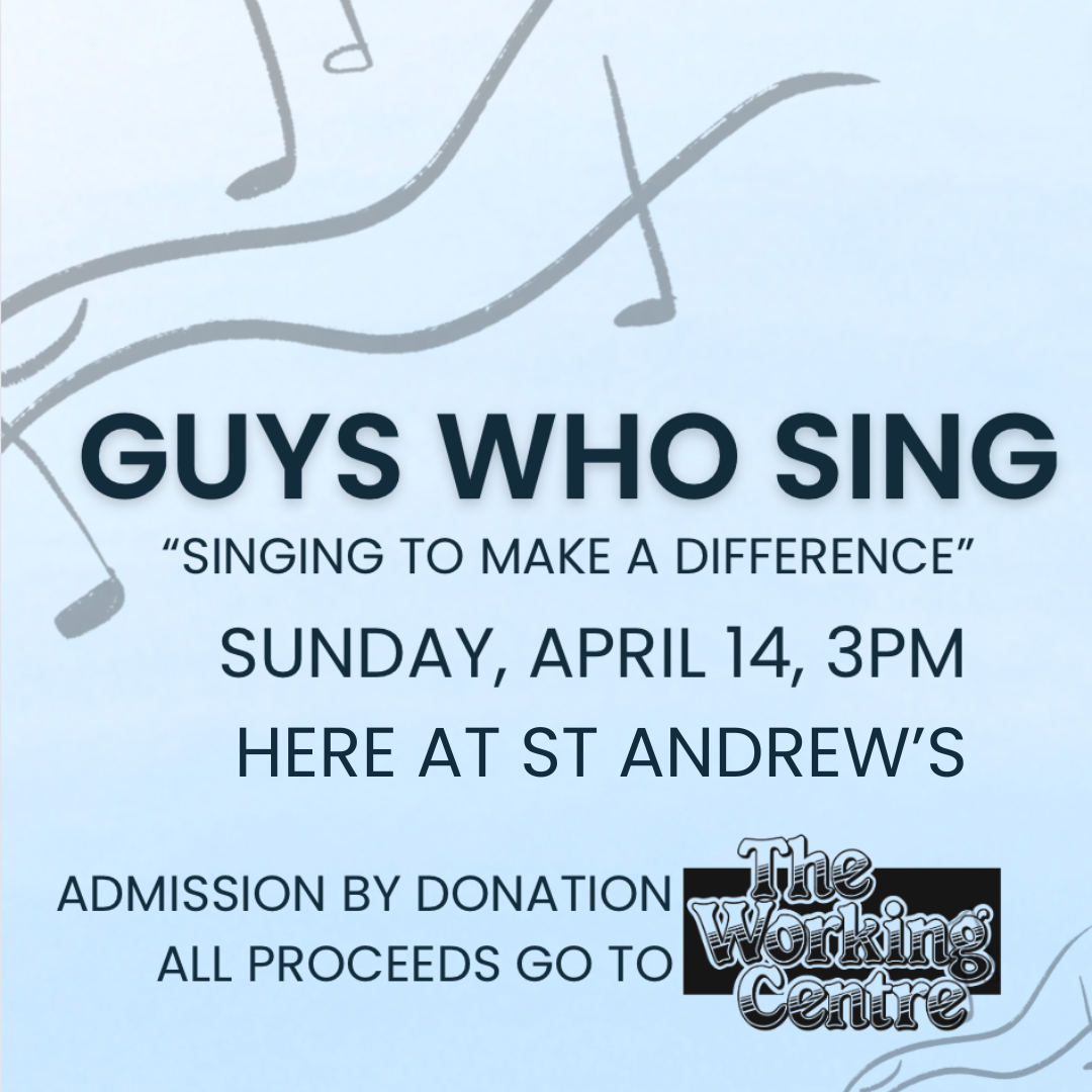 Come out to St. Andrew’s on Sunday, April 14 at 3 p.m. to hear a wonderful program of male choir singing, exceptional soloists and to support The Working Centre. Admission is pay-what-you-are-able. Mark your calendars and we’ll see you there!