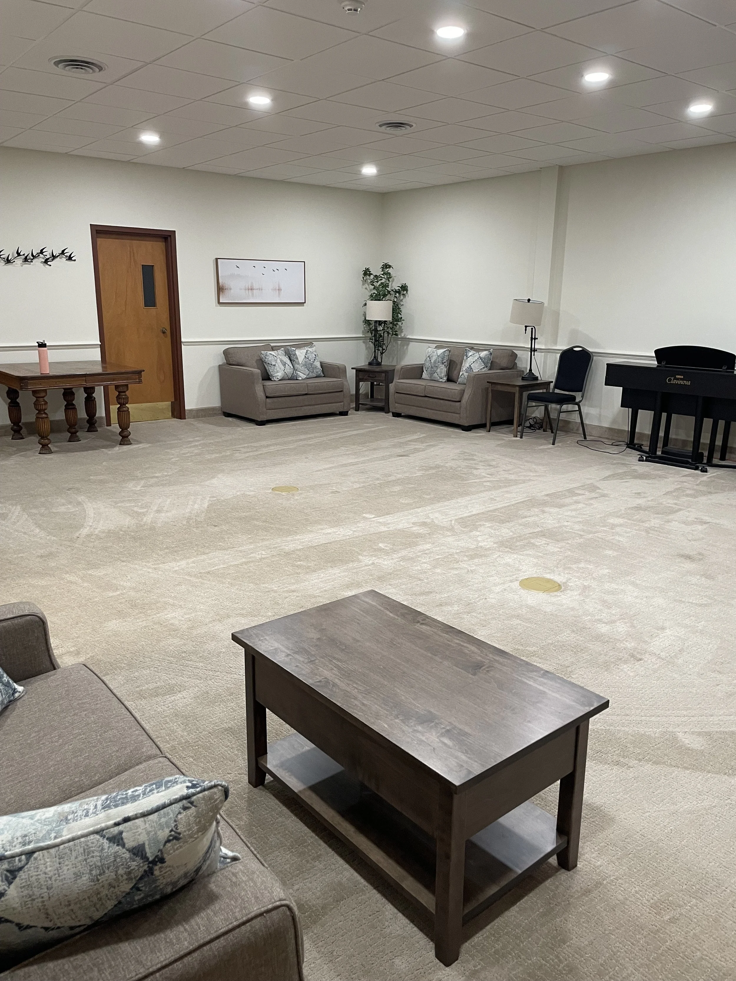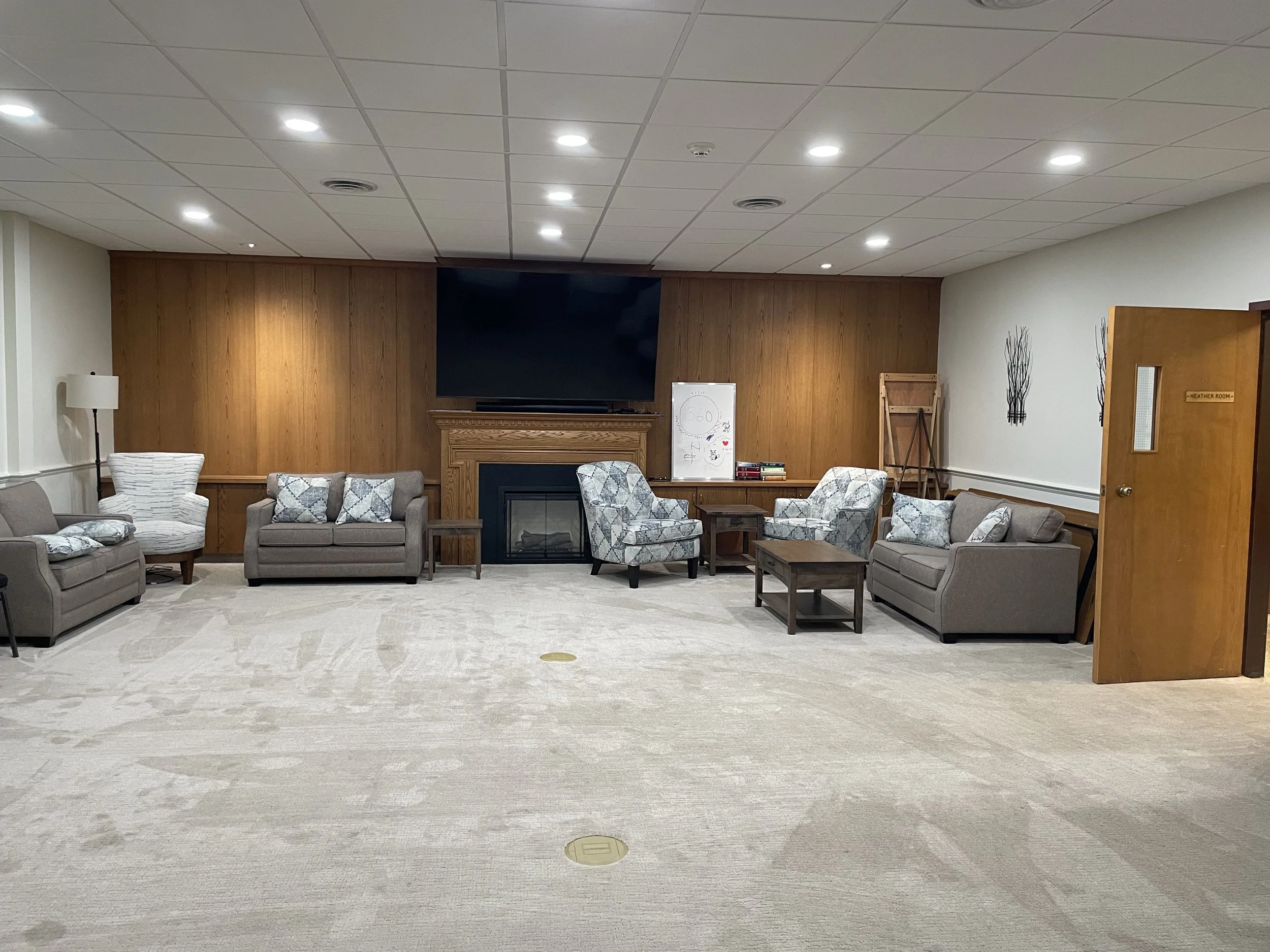Carpeted space with couches/chairs or meeting set-up with tables/chairs
